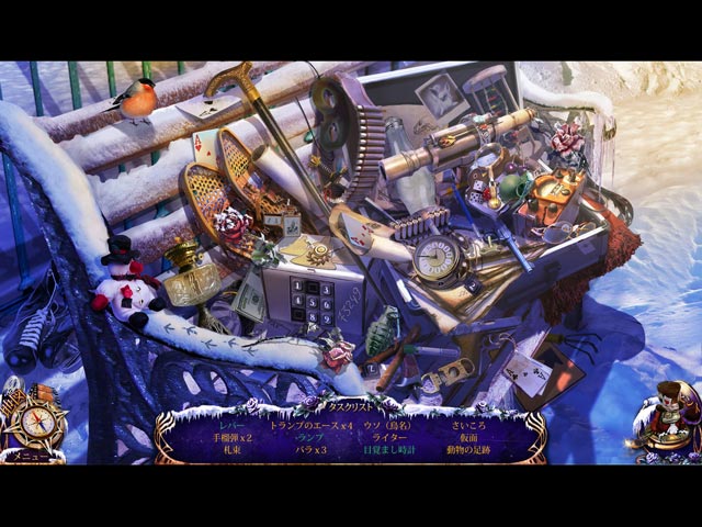 PC ダウンロードゲーム:アイテム探しゲーム 英語版タイトル:Mystery Trackers: The Four Aces 今すぐ「ミステリー・トラッカー:ザ・フォーエース」をプレイ!まずは無料体験版をダウンロードしよう。 郊外の小さな町ブライトフィールドは度重なる不気味な生き物の襲撃を受けて住民に避難命令が出た。記録的な寒波により大雪に見舞われ警察や民間団体のパトロール隊は町から撤退。現時点で町の実態は誰も把握できない状況だ。このニュースを見た秘密探偵社「ミステリー・トラッカー」捜査官のあなたは謎多き事件解明のため、果敢にも一人で町に降り立った。無料体験版で「ミステリー・トラッカー:ザ・フォーエース」をプレイするか完全版をダウンロードして町をくまなく捜査し、奇怪な生き物たちの存在の謎と今回の事件を操る黒幕を突き止めよう! - ミステリー・トラッカー:ザ・フォーエース