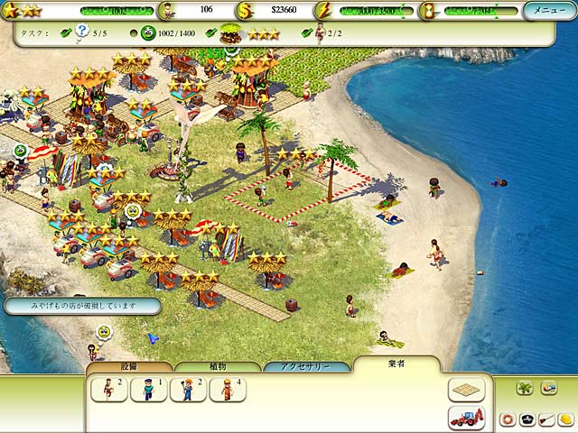 パラダイスビーチに建つリゾート地の支配人として仕事を任されたキミ。リッチなミスター・ゲイツからの助言を参考に美しい浜辺に世界有数のリゾート地を建設しよう。何から何まで自分でデザインできる箱庭スタイルで夢の楽園を生み出すのだ!さまざまなアイランドを手がけてリゾート業界に名を残そう!果たしてワガママなお客さんたちの欲求を満たすことはできるかな? - パラダイスビーチ