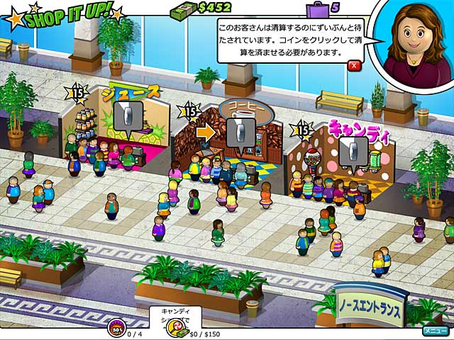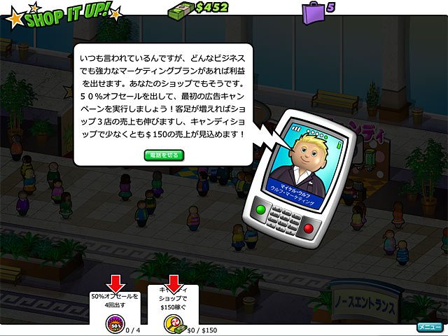 今日は新しいショッピングモールのオープニング日。あらら!お客さんがもう来ていますよ!でもまだモールの開店準備が出来ていな~い!新しいショップを次々とオープン&アップグレードして魅力的な商品や接客でお客さんを満足させてください!ショップは多種多彩でキャンディショップから本屋にベビー用品となんでもありです。地元の事業家からの挑戦に立ち向かいながら広告効果やショップの派手な外装でお客満足度と売り上げ増加に努めましょう。徹底した在庫管理で75のレベルステージでモール内のすべてのショップを運営しましょう! - ショップ・イット・アップ!
