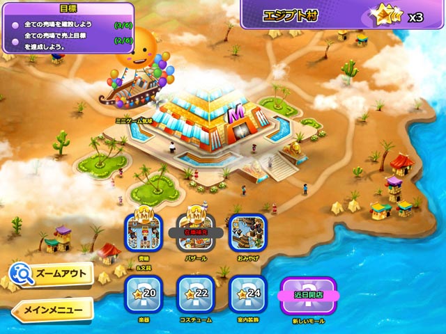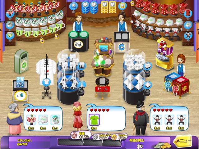 PC ダウンロードゲーム:タイムマネージメントゲーム 英語版タイトル:Shop-n-Spree: Shopping Paradise 今すぐ「ショップ&スプリー:リゾート大作戦!」をプレイ! まずは無料体験版をダウンロードしよう。 キミの故郷である南国の島…でも唯一の産業だった鉱山が閉鎖され、島の収入がなくなってしまった…島を昔のように活気ある場所にするにはどうすればいいんだろう?そこで島のみんなで話し合い、ショッピングリゾートを作ることに決定!国際色豊かな住人たちを象徴し、いろいろな国をテーマにしたショッピングモールを建設することになった。お客様に満足してもらえるようにスタッフをトレーニングし、サービスも充実させなければ!まずは無料体験版で「ショップ&スプリー:リゾート大作戦!」をプレイするか完全版をダウンロードしてホットなショッピングリゾートを作りあげよう! - ショップ&スプリー:リゾート大作戦!
