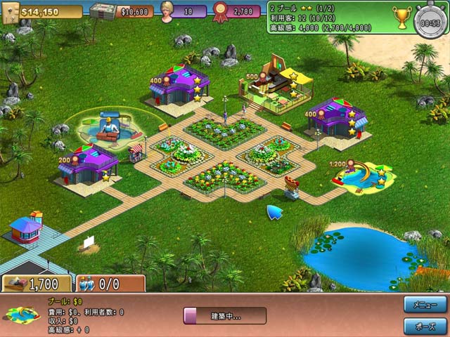 PC ダウンロードゲーム:タイム マネージメント ゲーム 英語版タイトル:Summer Resort Mogul 今すぐ「サマーリゾートエンパイヤー」をプレイ!まずは無料体験版をダウンロードしよう。 世界最大級のサマーリゾート経営者だった叔父さんが亡くなり、ケイトとジョンは叔父の会社の相続権を賭けてリゾートビジネスの一部を経営することに。後継者として試されることになったケイトを手伝ってリゾート経営者として成功しよう!コテージやホテルを建設して利用者を増やしながら映画館やレストランで利益を上げよう!古い建物のリフォームや解体をして新しい施設を建てながら、より楽しいリゾート地を完成させていこう! 無料体験版で「サマーリゾートエンパイヤー」をプレイするか完全版をダウンロードして、最高の経営者を目指せ! - サマーリゾートエンパイヤー