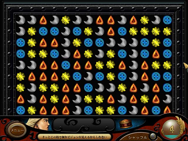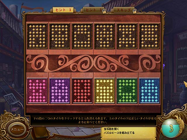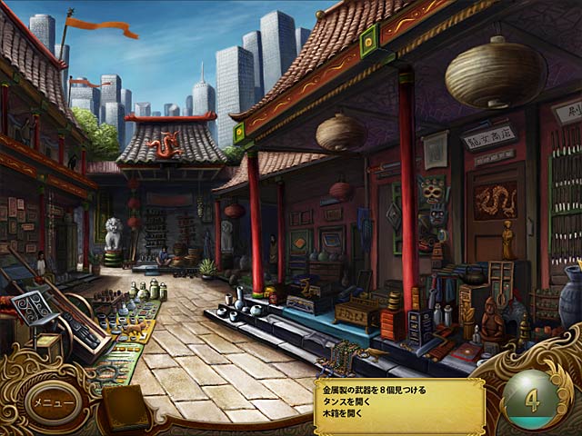 金属に触れることでその秘められた過去や未来を読み取れる不思議な能力を持つ主人公のデラ。旅先の中国で骨董品店の老婆から謎めいたアンティークの小箱をもらう。その箱には2千年もの間一人の古代戦士が魔法使いの呪いによって閉じ込められていた!2人の燃えるような愛と超能力を駆使して次々と起こる不可解な謎を解き、彼らを暗殺しようとする人物を阻止して中国から脱出しよう!キミが彼らの運命を握っている!ご注意:このゲームにはロマンチックな内容が含まれています。 - タイガーアイ Part 1 :呪いの箱