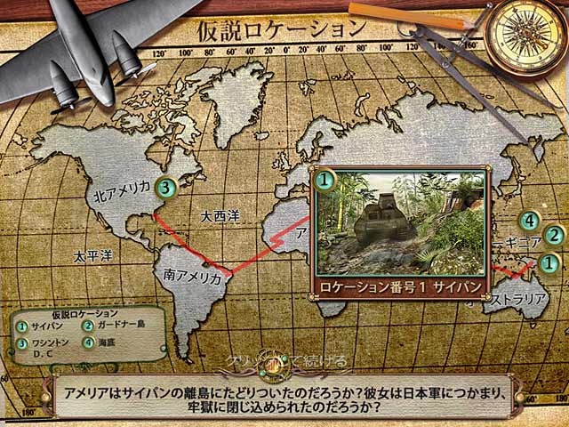 1937 年 7 月 2 日。アメリア・イアハートと航空士フレッド・ヌーナンは赤道上世界一周飛行のゴール直前に消えてしまった。アメリカ海軍による大規模な捜査の甲斐もなく跡形もなく消えてしまったのだ。いったい彼女に何が起こったのか?実話に基づいたストーリー、実在する歴史的ビデオそして彼女が残した数々の名言。現在でも様々な仮説が憶測されているこの史上最大の未解決ミステリーを明らかにせよ!あなたは涙なしでエンディングを見ることができるのか? - 未解決ミステリークラブ:アメリア・イアハート