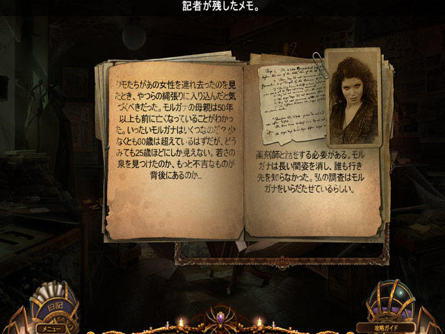 PC ダウンロードゲーム:アイテム探しゲーム 英語版タイトル:Web of Deceit: Black Widow Collector's Edition 今すぐ「裏切りの糸:ブラック・ウィドウ コレクターズ・エディション」をプレイ! まずは無料体験版をダウンロードしよう。 列車で旅をしていたあなたの客車に同席していた女性が不気味な機械仕掛けのクモにさらわれてしまった!女性を助けるべく列車を降りたのはクモがはびこる陰鬱な町アンドヴィル。町を探索するうちに徐々に明らかになってくるクモに魅せられた謎の女「モルガナ」と モルガナの怪しい魅力のえじきとなった男たちの物語。果たしてモルガナはどんな陰謀を企んでいるのか?さらわれた女性はどこに消えたのか?ミステリアスな雰囲気が味わえるアイテム探しアドベンチャー「裏切りの糸:ブラック・ウィドウ コレクターズ・エディション」の無料体験版か完全版をダウンロードして蜘蛛女の陰謀を阻止しよう! 当ゲームは特別先行リリースのコレクターズ・エディションです。コレクターズ・エディションをお買い上げの場合、特別ボーナスとしてマンスリー・スタンプカードにスタンプを 3 つ加算させていただきます。また、Game Club クレジット 2 つでコレクターズ・エディションをお買い上げいただけます。 追加コンテンツなど標準版にはない特典が満載! コレクターズ・エディション特典: - 裏切りの糸:ブラック・ウィドウ コレクターズ・エディション