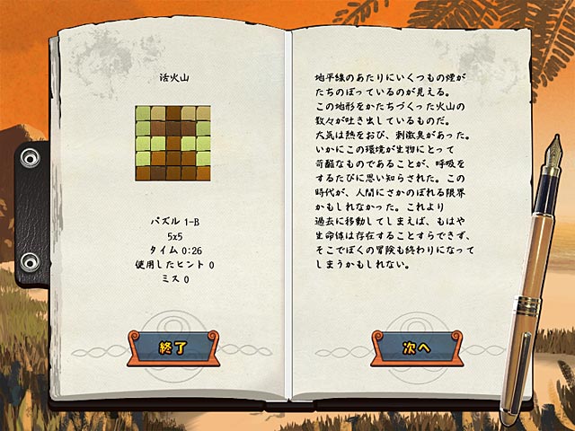 幻の大陸アトランティスに住んでいた人々の起源をさぐるうちに見つけた不思議な古代の砂時計。それに触れた瞬間、砂時計は壊れ周囲の空気が歪み、気がつくと翼竜の飛び交う古代の未開のジャングルに取り残されていた?!時間に影響を与えることのできる「タイムタイル」をモザイク模様の適切な場所に置いて壊れた古代の砂時計を元に戻そう。パズルを解いていくうちに次々と明らかになる古代文明の不思議や歴史。キミは無事に時間の歪みから脱出できるかな? - ワールド モザイク 2