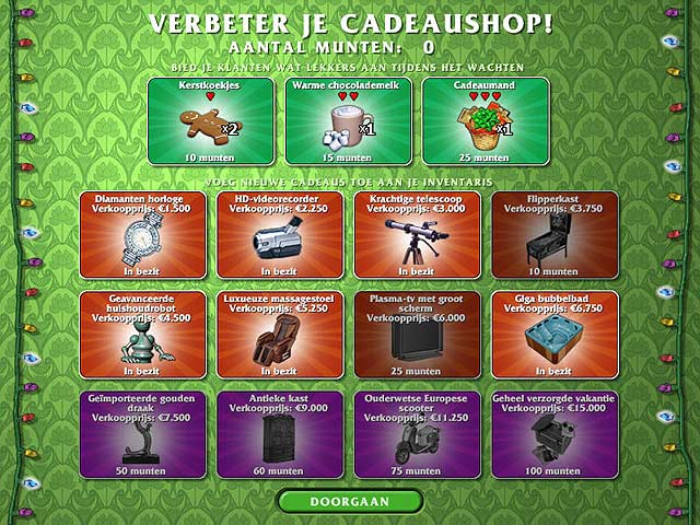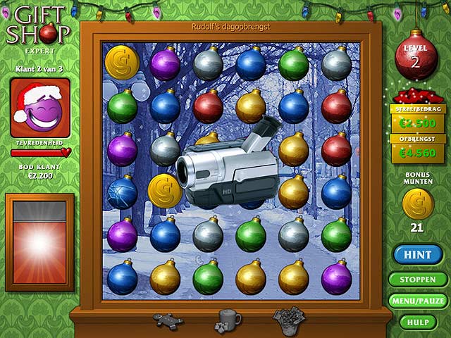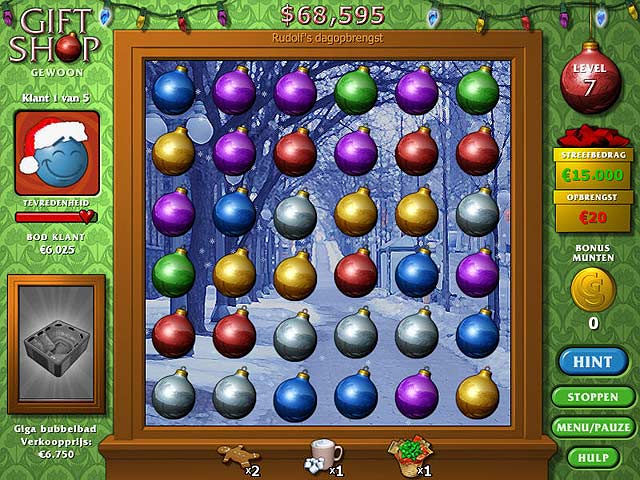 De kerstdrukte staat voor de deur en er is dus veel te doen! Je klanten hebben haast en willen natuurlijk de mooiste spullen kopen! Maak drie-op-een-rij en verwen je klanten met kerstlekkernijen om ze tevreden te houden. Schaf steeds nieuwe producten aan zodat je genoeg winst kan maken om de levels te voltooien in Gift Shop! - Gift Shop