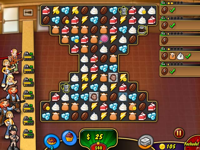 Combine 3 e prepare um delicioso cafézinho em Coffee Rush 3. Acabe com a concorrência! Atenda bem a sua clientela e fique atento ao entregar os pedidos de seus fregueses exigentes. Troque grãos de café, açucar, leite e sanduíches para ganhar dinheiro. Você quer fazer deliciosos cafézinhos e acalmar a clientela oferecendo rosquinhas e bolinhos grátis? - Coffee Rush 3