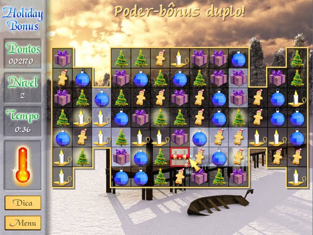 Holiday Bonus é um lindo jogo de combine três. Você terá a oportunidade de criar super-poderes usando lindas decorações de Natal. Monte sua árvore e divirta-se neste lindo jogo para relaxar seu espírito natalino. Você consegue decorar a sua árvore antes do Natal? - Holiday Bonus