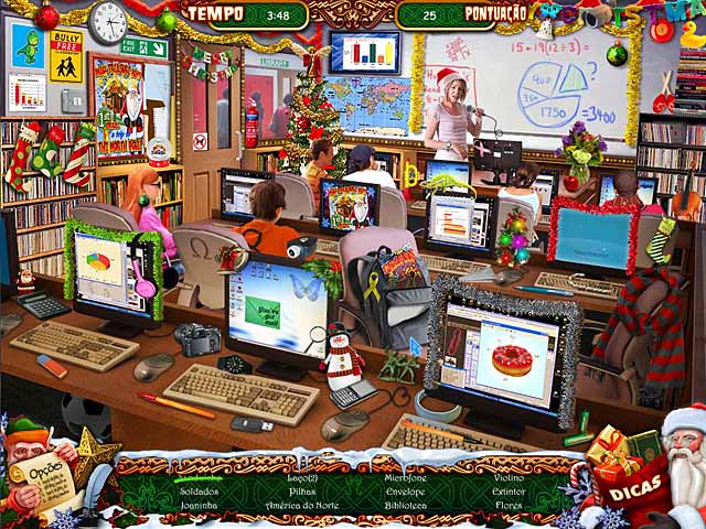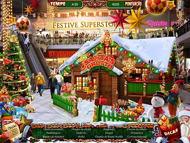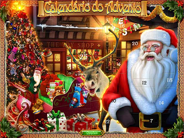 Encontre as cinco chaves de ouro e ganhe uma viagem grátis - um passeio no Expresso das Maravilhas para o Pólo Norte! Visite a casa do Papai Noel, conheça Rudolph e os Elfos, e ande em um carro de neve até a cidade para ver o Palácio da Princesa de Gelo, a igreja e o mercado de Natal! Desfrute de belas cenas de caça-objetos, jogue quebra-cabeças soberbos, e aproveite o calendário interativo de advento do Papai Noel antes de voar para casa na véspera de Natal no trenó do Papai Noel! Este jogo de Natal sensacional oferece diversão durante as férias para jogadores de todas as idades, e você não vai querer perder a grande surpresa que está esperando por você no final desta jornada mágica! - País do Natal 3