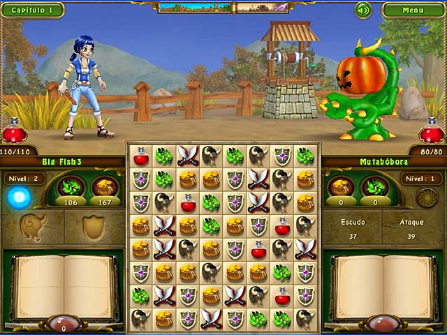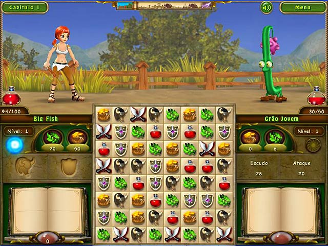 Como uma corajosa heroína, você deve libertar seu irmão de Zalok e seu temido exército de vegetais da escuridão! Duele com vagens, abóboras e mais de 50 legumes e verduras. Ganhe ouro o suficiente para comprar amuletos mágicos, armas, roupas e acessórios! Será que você consegue ser a heroína desse duelo de combine 3? - Puzzle Hero
