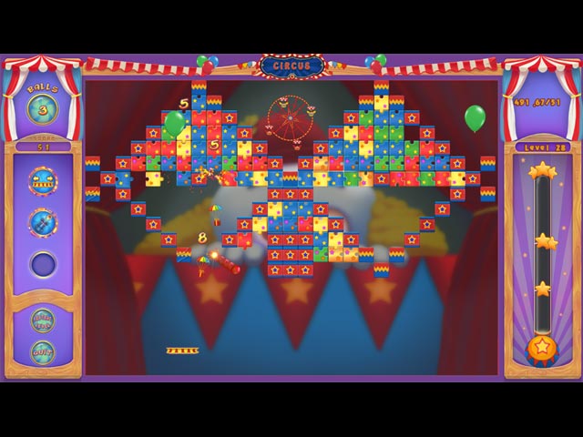In Ball of Wonder, the clowns are out for revenge in a colorful, circus themed break-out game! Destroy puzzle pieces, Ferris wheel seats, and clowns to complete each round. You'll get plenty of help from the power-ups that drop from above so be sure to catch them! - Ball of Wonder