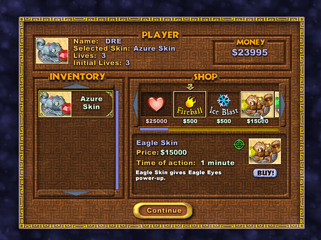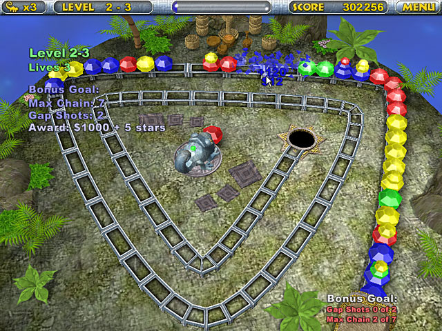 Immerse yourself into the mysterious atmosphere of an ancient land. A continuously moving chain of colored gems rolls past the stone idol of a chameleon. Guide the idol in blasting away these gems before they reach the hole. Rainbow powerups match any color of jewel, so make good use of them as the speed and complexity of the game progresses. If you get good enough, you can convert points into money in order to purchase new skins for the chameleon. - Chameleon Gems