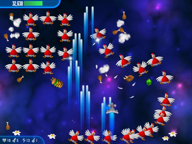 Chickens. For centuries we have oppressed them, grilling, roasting, stewing, and stuffing them in buns. The time has come for us to pay. Intergalactic chickens are invading Earth, seeking revenge for the oppression of their earthly brethren! It's time for you to fight for our ancestral right to omelettes. Will you succeed? Will the future of chicken burgers be secure? Or will you end up as part of the menu in a galactic chicken restaurant? - Chicken Invaders 3 Christmas Edition