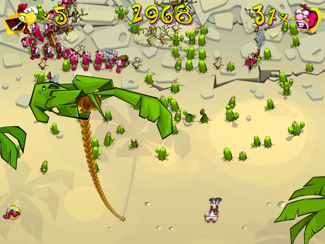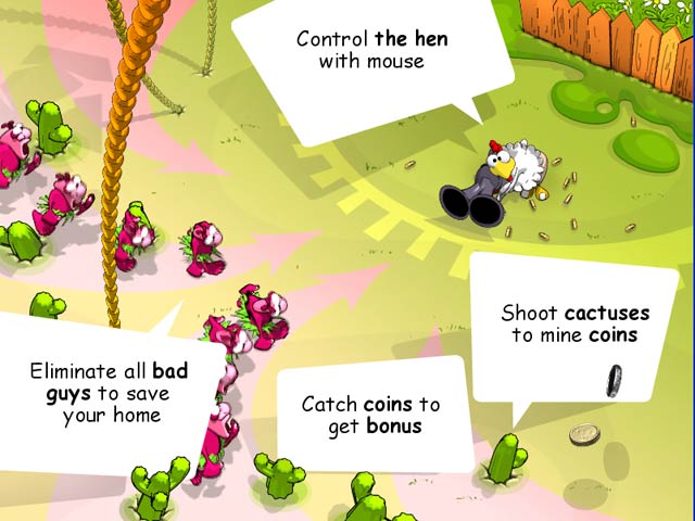 It's high time for chickens to avenge themselves against the hungry gluttons who've been tormenting these peaceful creatures for centuries. In Chicken Rush, it's your job to help the sweet hen, Paula, arm herself and home against the hen-hunting invasion. So come on.assist Paula in the fight for fowl freedom today; download this soon-to-be-favorite of game enthusiasts and chicken-lovers alike and get ready to watch feathers fly! - Chicken Rush