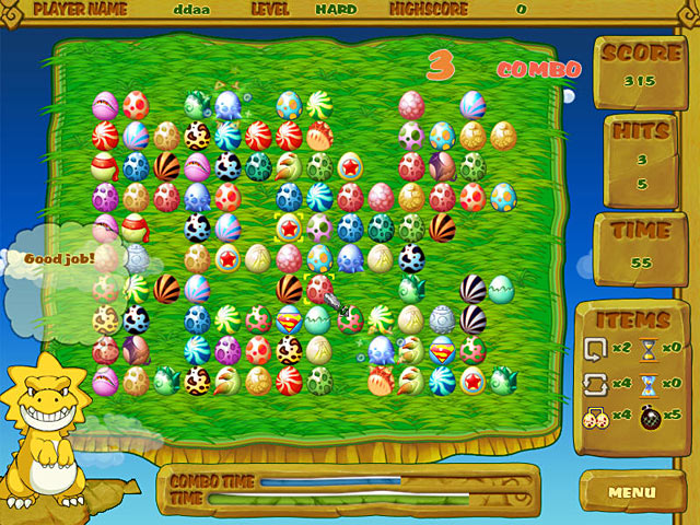 Start your adventure on the floating Dinosaur Island where you will help a tyrannosaurus collect lost eggs. Connect matching eggs with straight lines to clear the board and move on to your next destination. Special items will bring endless changes and unexpected adventures along your journey. - Crazy Eggs