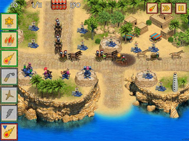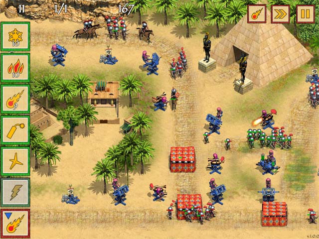 In Defense of Egypt, defend yourself against huge enemy armies on each level. Each level provides new tactical opportunities and increasing levels of difficulty. Explore a unique upgrade system for improving guns and spells. As the epic battle between Egypt and Rome wage on, use thoughtful calculation, quick response time and the assistance of the Gods themselves to punish the invading forces in this clever Tower Defense game. - Defense of Egypt
