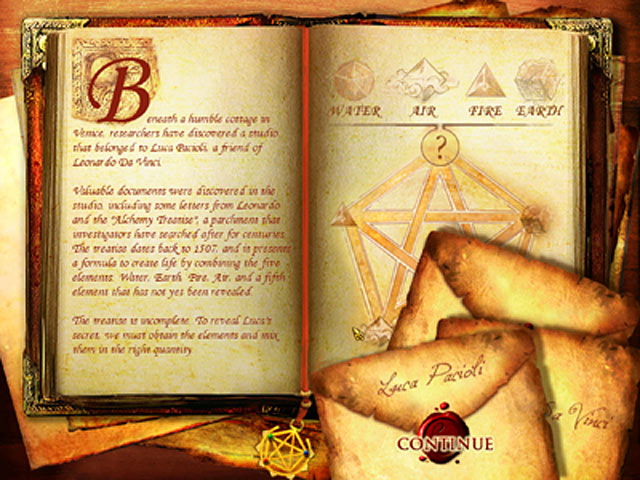 The discovery of the `Alchemy Treatise` by Leonardo Da Vinci provides an incomplete formula for creating the Elixir of Life. Follow the clues left by Da Vinci`s assistant on a scientific swap-and-match adventure using the four elements: Water, Earth, Fire, Air and an unknown fifth element. Swap elemental gems to make matches of the same type and size to merge and distill each element. As you distill each element, the energy created unlocks new combinations of gems using the five elements. - Elements