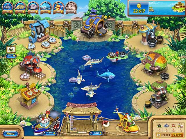 Raise a variety of exotic fish and manufacture never-before-seen products in Farm Frenzy: Gone Fishing, a fun and exciting Time Management game! Scarlett didn't know her new island farm contained a huge pond, but that's not stopping her from rising to the challenge. Help her make a big splash as she upgrades her production facilities, fends off bears, and buys and sells goods across land and sea! - Farm Frenzy: Gone Fishing
