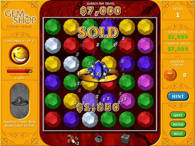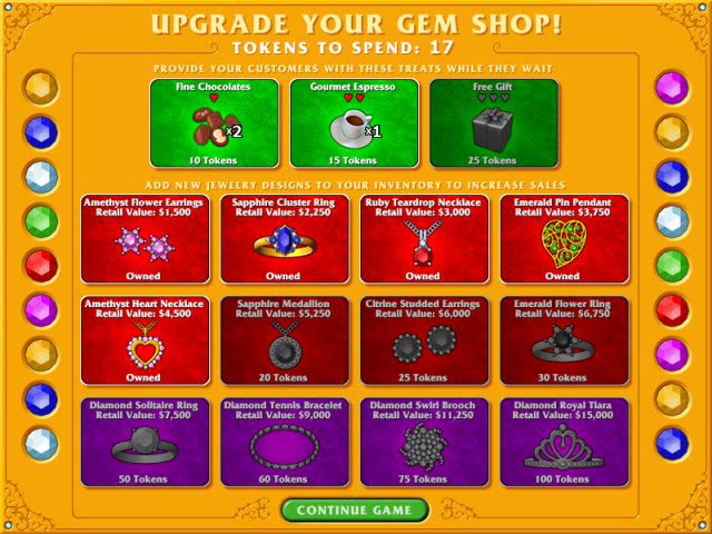 Match colorful gems and keep your jewelry customers happy! Sell gems and jewelry to your smiling consumers, but watch out! Keep them waiting too long and they'll start to grumble. You'll need to give them a marvelous treats to keep them happy (and get the sale)! Special tokens allow you to upgrade your shop with more jewelry and customer-appreciation treats. Remember: Happy customers spend big bucks, and keep your gem shop open for business! - Gem Shop