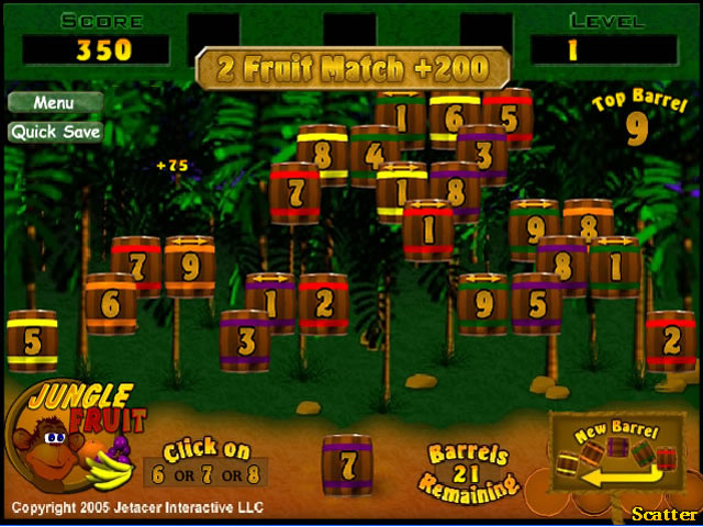 Enter the jungle and take on the fruits of nature. Battle your way through stacks of barrels as you release the fruit inside. The gameplay is simple, but it will take a lion's share of speed to become the king of the jungle and keep this game under control. Don't let those monkey's get under your skin! Release the Jungle Fruit fun! - Jungle Fruit