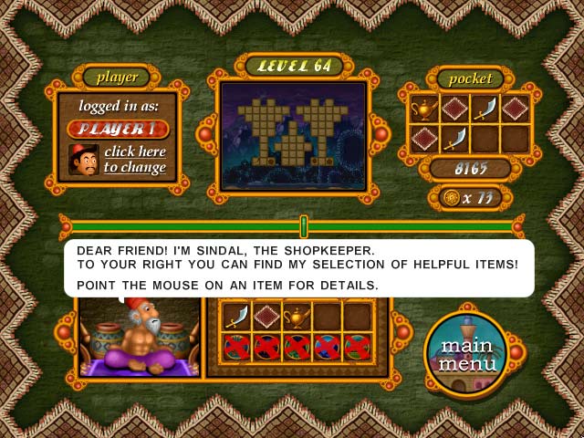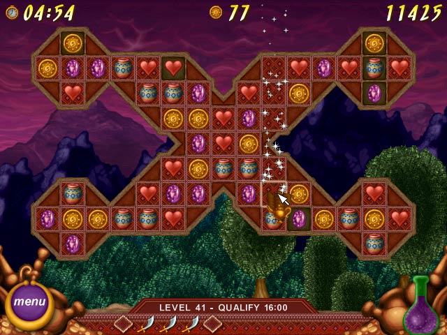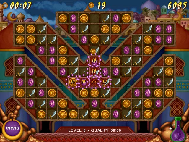 Go on an exotic trip throughout the land of Aladdin in this adventurous icon matching game. Pick your favorite character and recover the 120 missing pieces of the magic carpet, collect potions and trade valueful items with the shopkeeper in town. Make the legend come true and find yourself flying towards the lands beyond your deepest imagination. - Legend of Aladdin