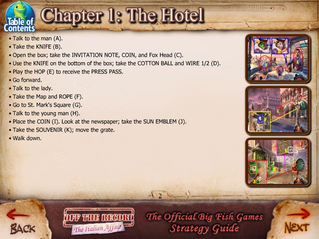 Follow our crystal clear instructions and helpful tricks to get you through the rough spots! Solve those tricky puzzles. Figure out where you’re supposed to go next. Get tips and hints from our handy Strategy Guide! Written by our Casual Game Experts, each Strategy Guide comes with large, detailed screenshots, and fantastic descriptions. - Off the Record: The Italian Affair Strategy Guide