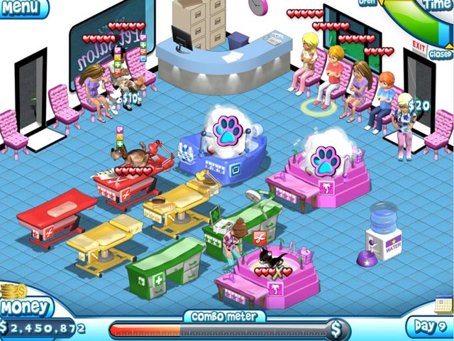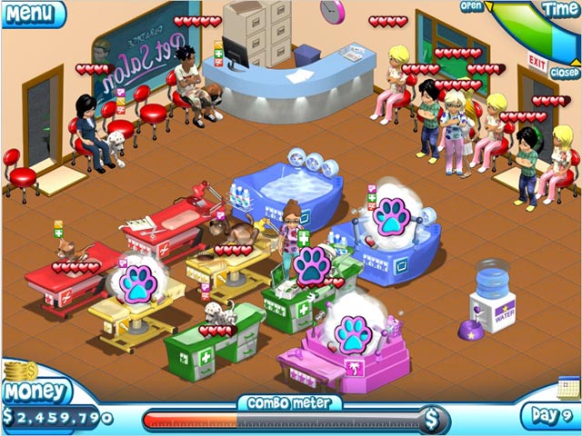 This is no day at the spa! It`s you versus Pet Corp in this fast paced fur flying good time. Your pet spa is competing against the evil Pet Corp. You`ll turn a small corner spa into a huge success with fast and hard work. But it`s not all about speed. You`ve also got to plan ahead. Serve hundreds of great pets and people too so you can earn more money to improve your spa by buying upgrades and special treats for your furry clients too. Fur has never been this fun or exciting. - Paradise Pet Salon