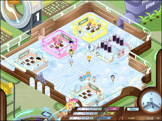 After getting her Super Master`s degree, Victoria Bright set out to build a school for the talented and gifted. Now established, aid Principal Bright in her quest to cultivate and educate her budding geniuses. Sheppard students through their days at Brainiac Elementary and maximize their learning potential. Grow your school, staff, and its offerings as your Jr. Einsteins mature. From potty breaks to hallway monitoring, it`s one funky School House Shuffle. - School House Shuffle