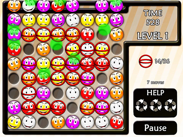 You won't be able to stop smiling at this bright and cheery puzzle game. Line up three or more Smileys of the same color, and watch them disappear. Progress through levels by clearing a set number colored Smileys from the board. Try Challenge mode for some extra tricky tasks! Let these Smileys make your day! - Smileys