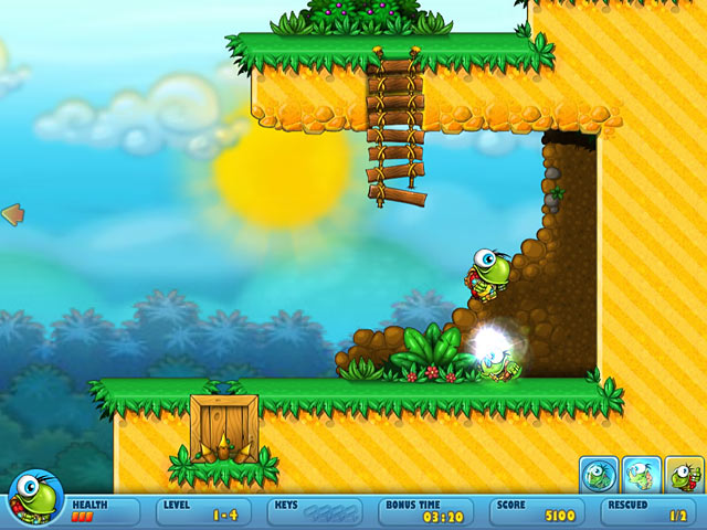 Help a heroic turtle navigate three gorgeous game worlds dripping with detail. Block the bad guys on their mission to capture toddler turtles in this side-scrolling Arcade game. Use your brain to eliminate traps and obstacles while crushing dozens of enemies with crates. Navigate 60 wondrous worlds with loads of puzzles while collecting bonuses and power-ups. Can you recover the baby turtles in Turtix 2 Rescue Adventure? - Turtix 2: Rescue Adventures