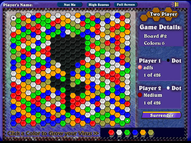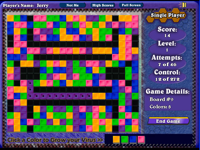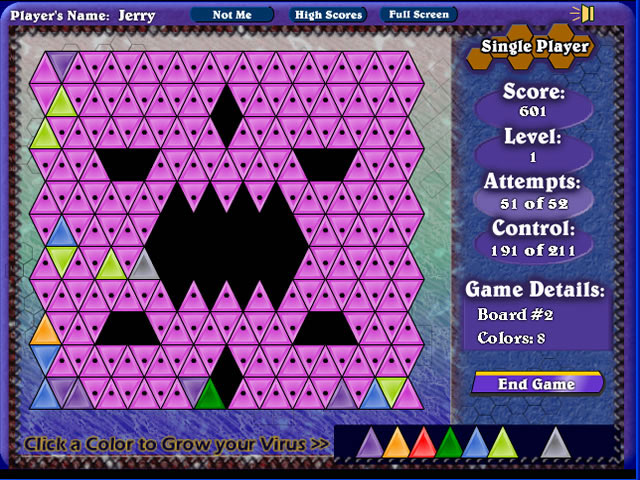 Grow your virus to cover the whole playing field, but watch out how many moves it takes to do it. This game offers 3 different board shapes to play and 9 unique layouts for each shape. There are no timers so you can play at your own pace, but it does require a little strategy. There are so many game play options, you will enjoy many hours of entertainment. - Virus 3