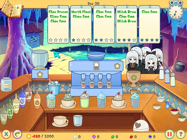 Serve yummy drinks to fairytale creatures in the stylish Factory. Decorate your drink stand with moon beams, slug slime, and other wondrous elements. Use a blender for summer smoothies and concoct your own recipes. What`s great with chocolaty dessert drinks? Top them with whipped cream, cookies, and fairy dust. Visit five villages in the Yummy Drink Factory and savor this Time Management treat. - Yummy Drink Factory