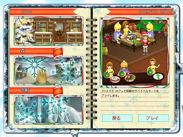 PC ダウンロードゲーム:タイムマネージメントゲーム 英語版タイトル: Amelie's Cafe: Holiday Spirit 今すぐ「アメリーのカフェ:クリスマス」をプレイ! まずは無料体験版をダウンロードしよう。 今まで数々のカフェを成功させてきたアメリーと一緒にクリスマスをお祝いしよう!ターキー、ジンジャークッキーなどクリスマスならではの特別メニューでお客様に素敵なクリスマスシーズンを過ごしてもらおう!50 を超えるレベルをクリアして、サンタさんのソリをプレゼントで一杯にしよう。選べるキャリアモードとサバイバルモード。無料体験版で「アメリーのカフェ:クリスマス」をプレイするか完全版をダウンロードして上級者用のサンタモードをクリアして栄光の印をゲットしよう! - アメリーのカフェ:クリスマス