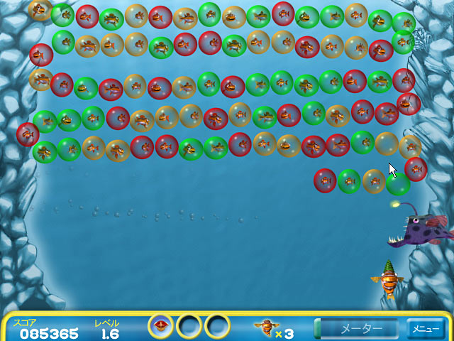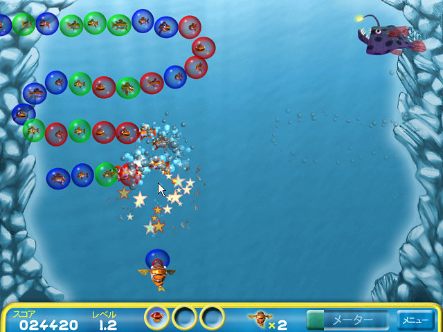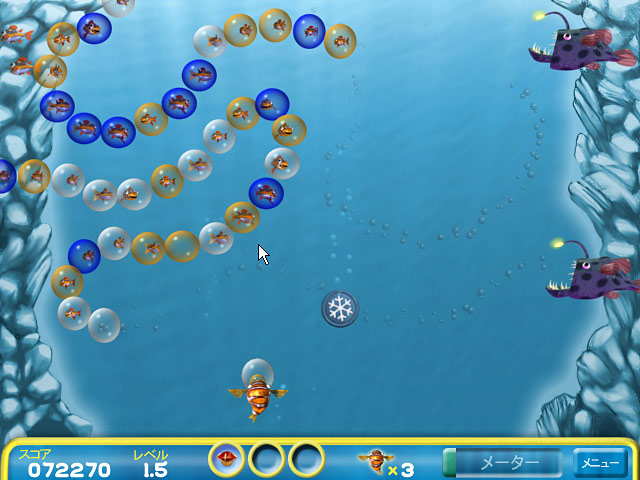 このはじけんばかりのアクションパズルでは、同じ色のバブルを並べてはじかせて、中の魚たちを救い出します。 的を定めてすばやく引金を引けば、成功間違いなし!どう猛な魚に食べられちゃう前に早く助け出そう! - バブル フィッシュ ボブ