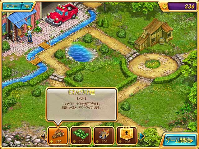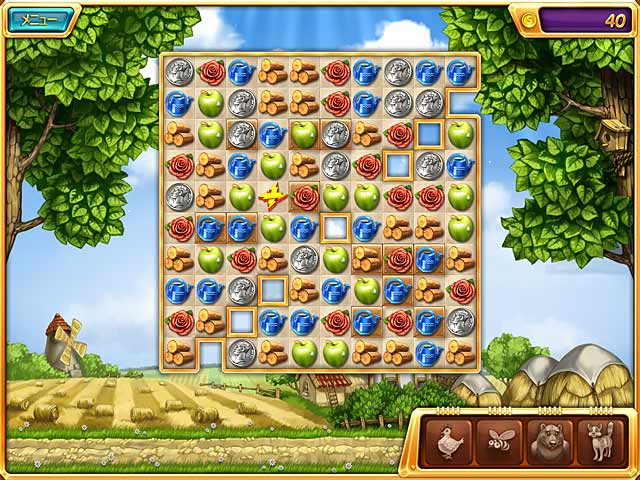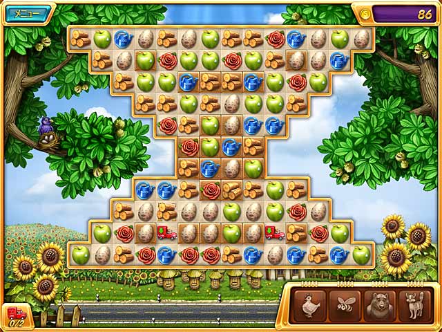 PC ダウンロードゲーム:マッチ 3 ゲーム 英語版タイトル:Crop Busters 今すぐ「クロップバスターズ」をプレイ! まずは無料体験版をダウンロードしよう。 荒れ果ててしまった小さな農園を復興させよう!農作物をマッチさせて収穫し、制限時間以内にトラックを作物でいっぱいにして市場で売ってお金を稼ごう!稼いだお金で建物を購入して新しいスペシャルボーナスアイテムを手に入れるのだ。クマやにわとりなど可愛い動物たちがあなたのお手伝いをしてくれます。グラフィックも綺麗で楽しくて病みつきになる最新マッチ 3 ゲーム!無料体験版で「クロップバスターズ」をプレイするか完全版をダウンロードしてトロフィーを全部獲得しよう! - クロップバスターズ