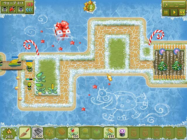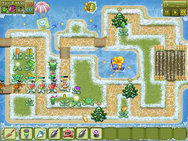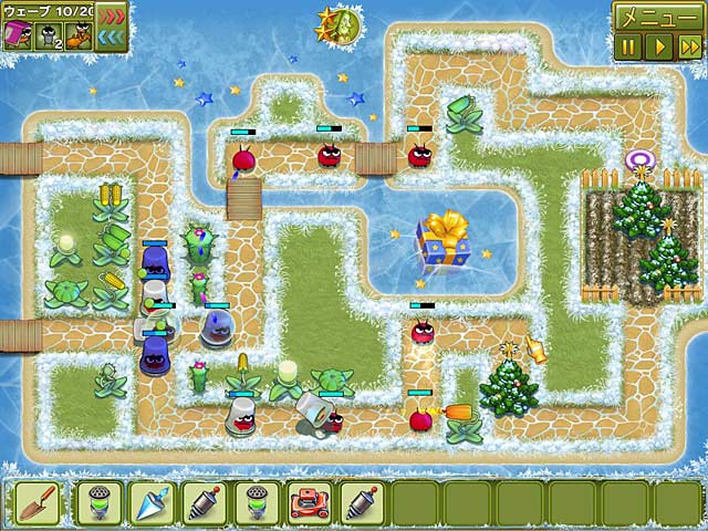 PC ダウンロードゲーム:アーケード & アクションゲーム 英語版タイトル:Garden Rescue: Christmas Edition 今すぐ「ガーデン レスキュー:クリスマス・エディション」をプレイ! まずは無料体験版をダウンロードしよう。 みんなが楽しみにしているクリスマスがやってきた。ところが過去の敗北の借りを返そうと復讐心に燃える昆虫たちが庭を攻撃しようと企んでいたのだ!今回のやつらの狙いはクリスマスツリー。クリスマスの庭になくてはならないクリスマスツリーをずる賢い昆虫たちの手から守ろう!空爆、凍結、ガス攻撃、ハリケーンなどさまざまな攻撃を駆使して敵を撃退しよう!庭の住民全員が力を合わせればきっと昆虫に勝てるはず!クリスマスツリーをアップグレードしてさらにコインを集めよう。無料体験版で「ガーデン レスキュー:クリスマス・エディション」をプレイするか、完全版をダウンロードしてみんなの庭を守り、平和でハッピーなクリスマスを迎えよう! - ガーデン レスキュー:クリスマス・エディション