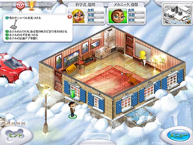 ひどい吹雪に見まわれた山中にある美しいロッジに泊まっていた世界的に有名な科学者バーンズ教授との連絡が途絶えてしまった…教授の娘とチームメンバーとともに教授の行方を探すアドベンチャーが今始まる!登場するキュートなキャラクターの健康状態やハッピー度を常にチェックするのを忘れずに。能率よく探索するには栄養と休養をたっぷり取ることが最大の鍵! - Great Adventures: レスキュー大作戦!