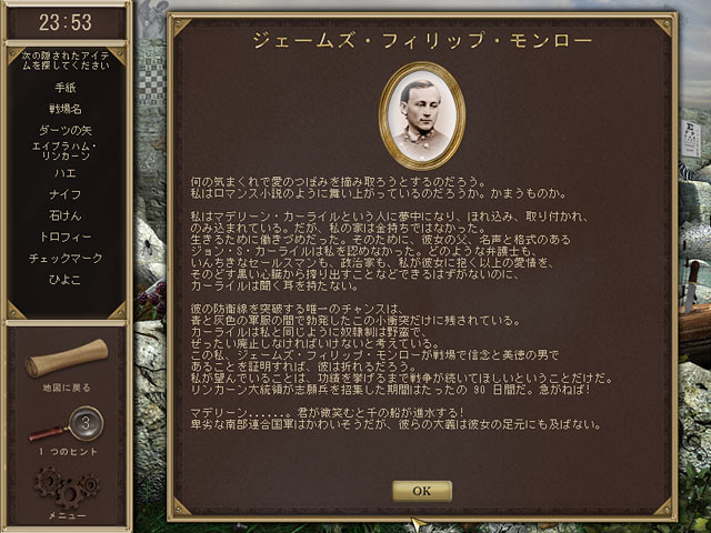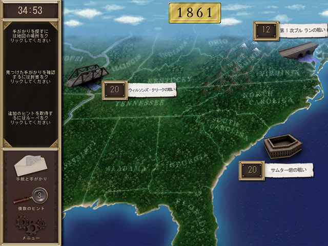 アブラハム・リンカーンの忠実な家臣であるアレキサンダー将軍と一緒に南北戦争を再現しよう!秘密結社のメンバーによって残された手紙と手がかりを探して南北戦争で実際に戦場となった場所を捜索。1861 年のサムター砦の戦いから、1865 年のアポマトックスでリー将軍が降伏するまで、20 のアイテム探しの場所を調査。川を渡り、緑の丘を越え、南北戦争の隠された謎を暴こう! - ヒドゥン ミステリーズ - 南北戦争の隠された謎