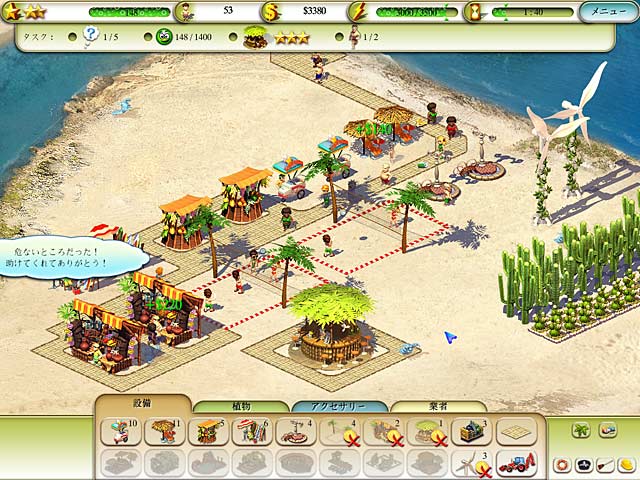 パラダイスビーチに建つリゾート地の支配人として仕事を任されたキミ。リッチなミスター・ゲイツからの助言を参考に美しい浜辺に世界有数のリゾート地を建設しよう。何から何まで自分でデザインできる箱庭スタイルで夢の楽園を生み出すのだ!さまざまなアイランドを手がけてリゾート業界に名を残そう!果たしてワガママなお客さんたちの欲求を満たすことはできるかな? - パラダイスビーチ