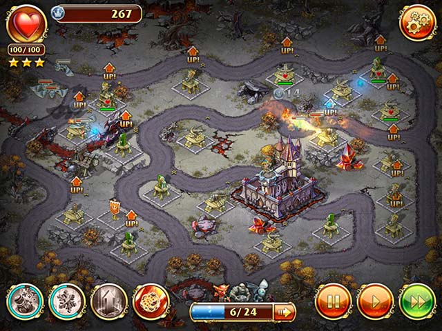 PC ダウンロードゲーム:戦略ゲーム 英語版タイトル:Toy Defense 3 : Fantasy 今すぐ「トイディフェンス 3 : ファンタジー」をプレイ! まずは無料体験版をダウンロードしよう。 ドラゴンが襲ってきたぞ!位置につけ!今回の舞台は 10 世紀にまでさかのぼる。次々と襲い掛かってくるドラゴンや荒々しいモンスター達を倒すため、司令官の役目は超重要だ。最強の兵士、勇敢な射手、味方のゴブリンに偉大な魔法使いなどの戦士達をさらに強くするために戦いの最前線に立ち指揮をとる。戦士達は戦いの勝利を得るたびにどんどん強くなっていくのだ。時には負けて城をのっとられるかもしれないが、決して戦いをあきらめてはいけない。果てしない数の敵と入り乱れる戦場はまさに壮絶であり、ゲームに惹きこまれること間違いなし。たくさんのレベルを攻略して、それぞれのスキルに特化したパワーアップを目指していこう。最高の戦士とは?城を守るために必要な強さとは一体?次々と襲ってくる敵たちに対抗するために最強の戦略と戦士を兼ね備えていざ出陣だ! - トイディフェンス 3: ファンタジー