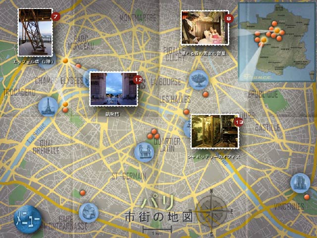 花の都パリの 22 ヶ所の名所と旧跡を大迫力の 360° のパノラマビューで楽しみながらお土産を探す旅。あなたの旅はパリの中心地からスタート!まずは有名なシャンゼリゼ通り、エッフェル塔、凱旋門から訪れよう。パリへ旅行したことのある方もない方も、このゲームでパリの街並みをゆったりと堪能しよう。 - トラベローグ 360 : パリ